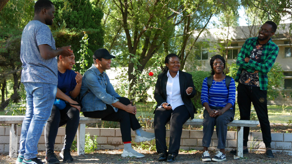 ↑9月5日,张宁(右三)和留学生在操场上聊天。新华社记者 杨青摄